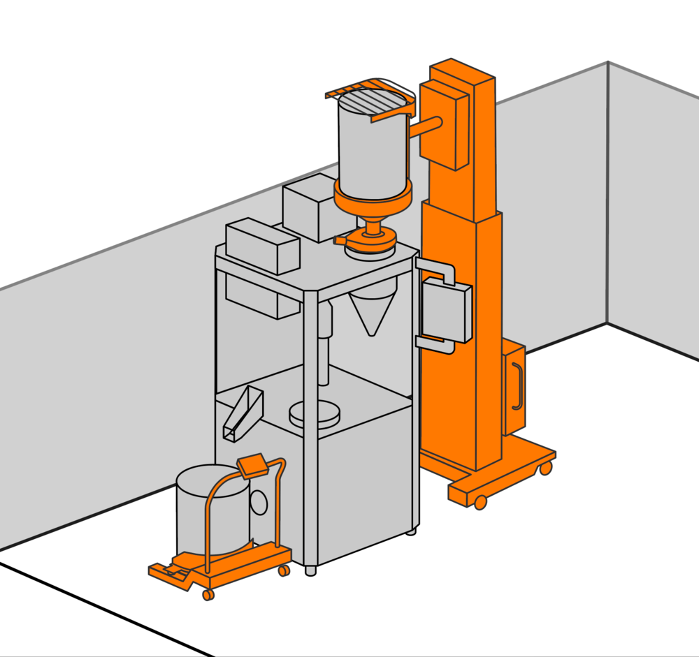 Encapsulation is one of the final steps of the manufacturing process and requires the final blended powder to be transferred into the encapsulation machine. Preventing product segregation, providing a consistent product feed-rate, and managing dust control are all common challenges with this process. Rheo offers several material handling packages for this process. A slewing Drum Inverter with a single or dual sided powder feed chute provides an operator friendly, semi-closed powder transfer system. An integrated Ventilation Sleeve provides local dust extraction at the transfer connection.