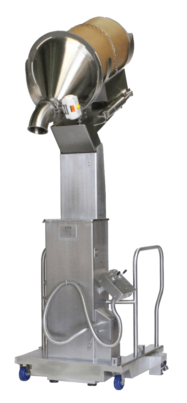Tablet packaging requires gentle handling of tablets as they are introduced into the packaging machine fill hopper. Rheo offers a Variable Height Drum Tipper solution that places the drum of tablets over the fill hopper to allow a flood feed of tablets. This system is supplied with a tablet friendly control valve to control the flow of tablets into the hopper. Depending on how dusty the tablets are, a Ventilation Sleeve can be used to provide local dust extraction to improve containment for this process.