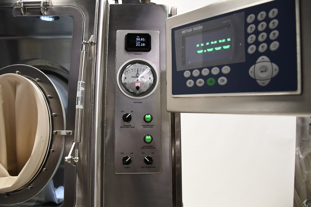 A sample can be taken from the drum and measured out on a bench scale located in the flow hood. After the sample is taken, product can be transferred within the glovebox into the receiving drum, which is positioned on integrated load cells. The drum can be filled to the desired weight, which is shown on the scale readout.