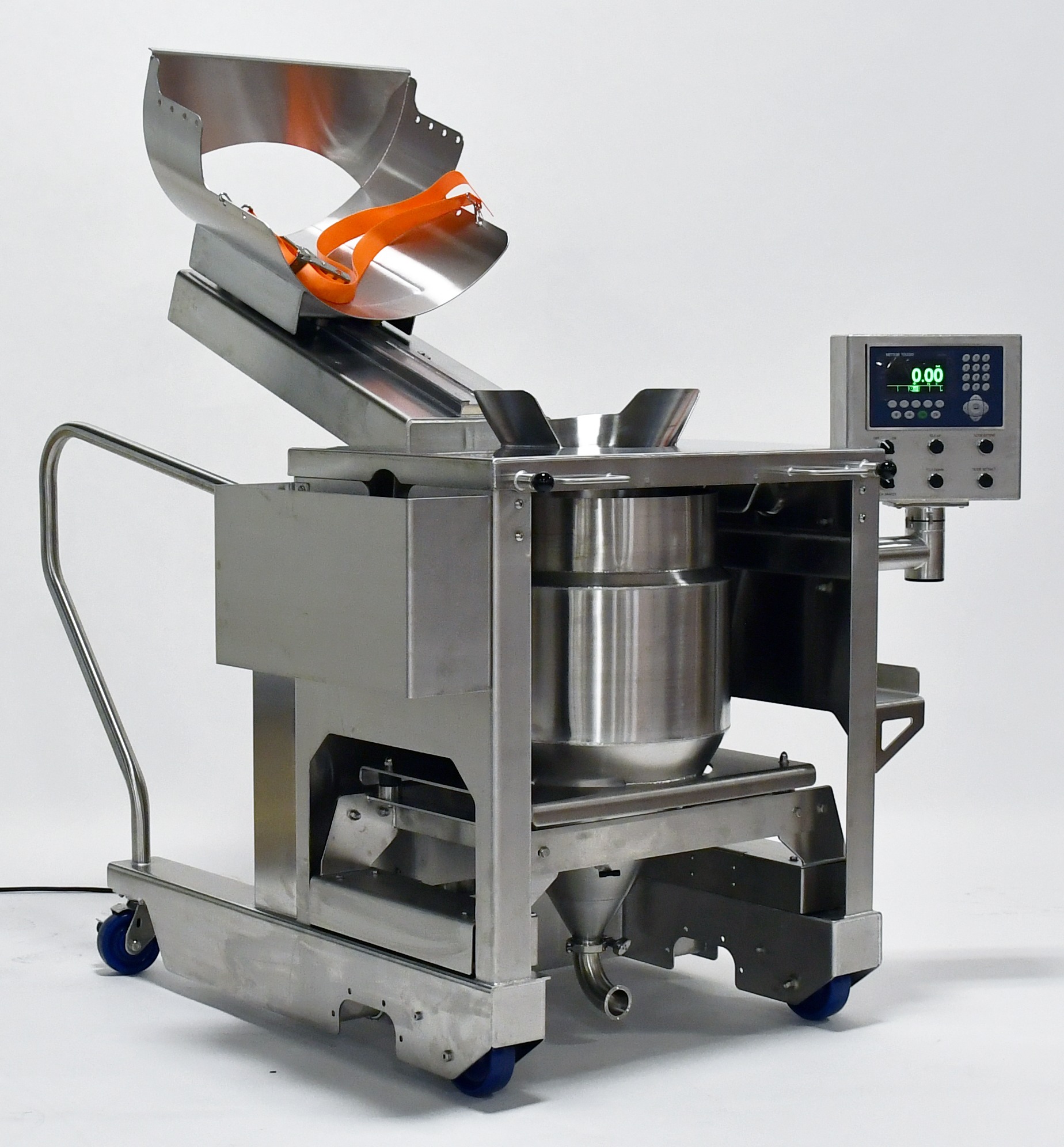 For this project, the customer had a requirement to vacuum convey powders out of drums into a small mixing vessel. The vessel is brought to a vacuum in order to convey the material out of the Material Transfer Station hopper. Several customizations were made to accommodate the process requirements. A Mettler Toledo weighing system was added to the vacuum hopper to allow the operators to convey specific amounts by mass into the vessel (accuracy +/- 100g). The scale readout was equipped with a communication ethernet port for connection to the client’s printer, for creation of batch records. A custom shelf for the client’s printer was included. The standard fold down side table was replaced with a custom stainless steel tool basket, and the table top of the MTS was equipped with a backsplash to keep the work area clean as powder is dispensed into the hopper. The hopper was also equipped with a screen to prevent unwanted articles from being conveyed into the vessel, as well as nitrogen ports to keep the vessel environment inert as air from the hopper is pulled into the process after the powder is emptied.