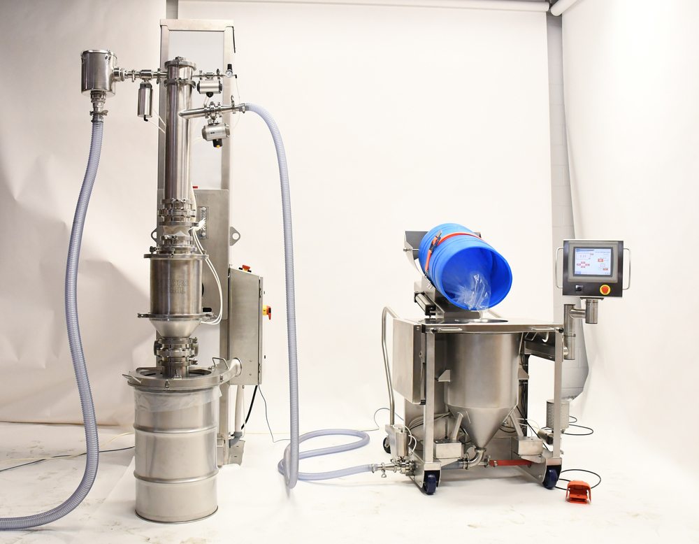 The Material Transfer Station provides an ergonomic work station to transfer material out of bags or drums and into a vacuum hopper that is positioned on load cells for precise weighing. The material can then be vacuum transferred using the Vacuum Conveyance System before it is discharged through a mill or screener and into bins or drums.