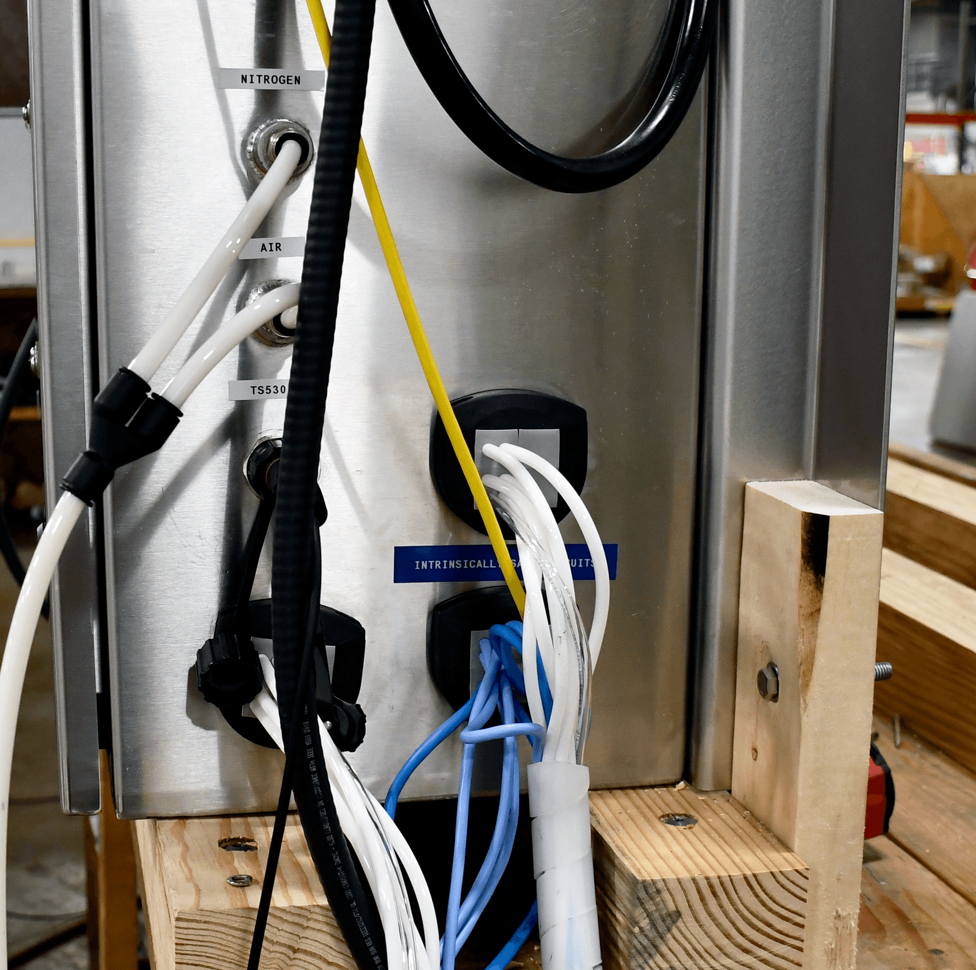 Rheo provided the controls for all the equipment, managed by the operator through a touch screen Pepperl & Fuchs HM. Atmosphere control (negative pressure and oxygen concentration) was managed in the isolator automatically via PID control loops. All equipment was designed for use in a Class I, Division 1 Group C&D area via a combination of intrinsically safe, purged and pressurized, and explosion proof components. Purging system also provided by Pepperl and Fuchs EPS 6000 Type X purging system. Fiber Optic communications allow MTS to safely communicate between vacuum conveyance receiver control panels, mobile vacuum pump skid and client plant control system.