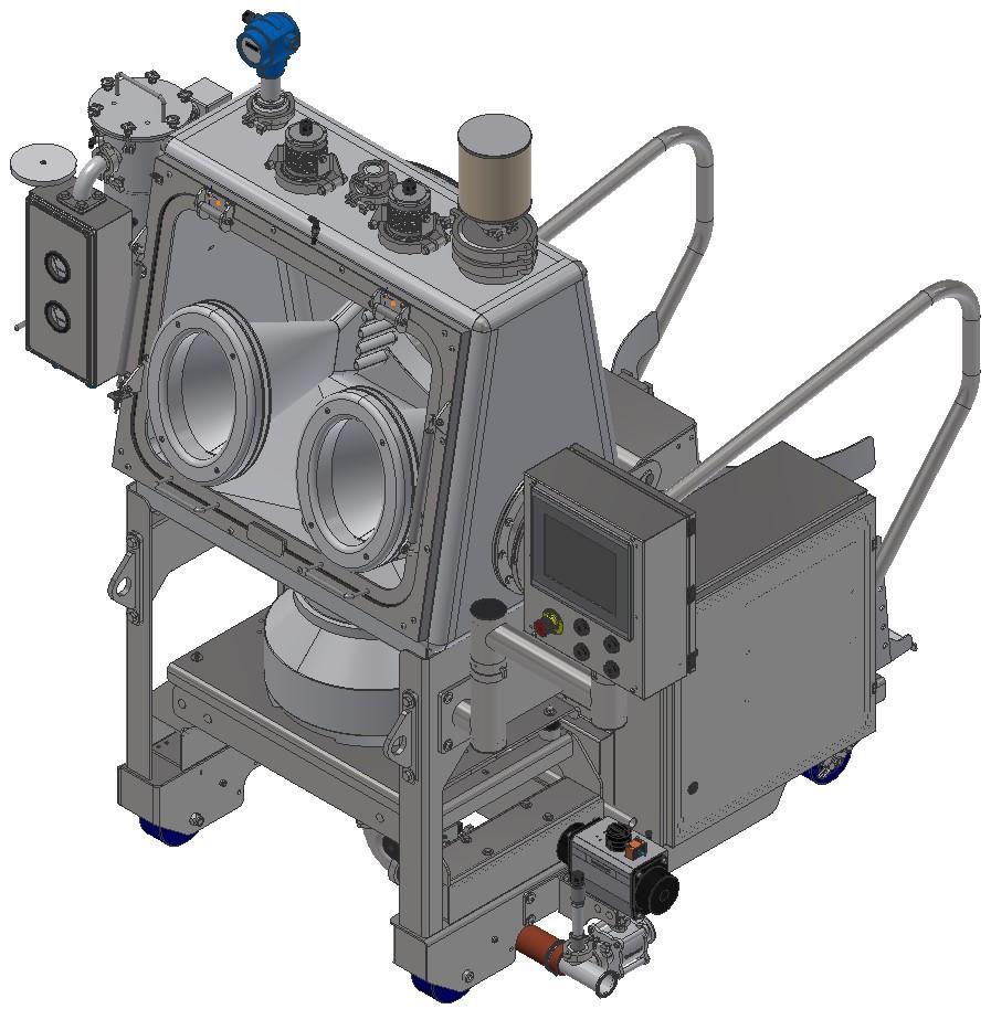 Rheo provided the controls for all the equipment, managed by the operator through a touch screen HMI. Atmosphere control (negative pressure and oxygen concentration) was managed in the isolator automatically via PID control loops. All equipment was designed for use in a Class I, Division 2 Group C&D area via a combination of intrinsically safe, purged and pressurized, and explosion proof components. Ethernet communications allows the MTS to communicate between vacuum conveyance receiver control panel and mobile vacuum pump skid. The MTS was equipped with a compressed air powered integrated venturi blower, with dual safe change HEPA filter extraction.