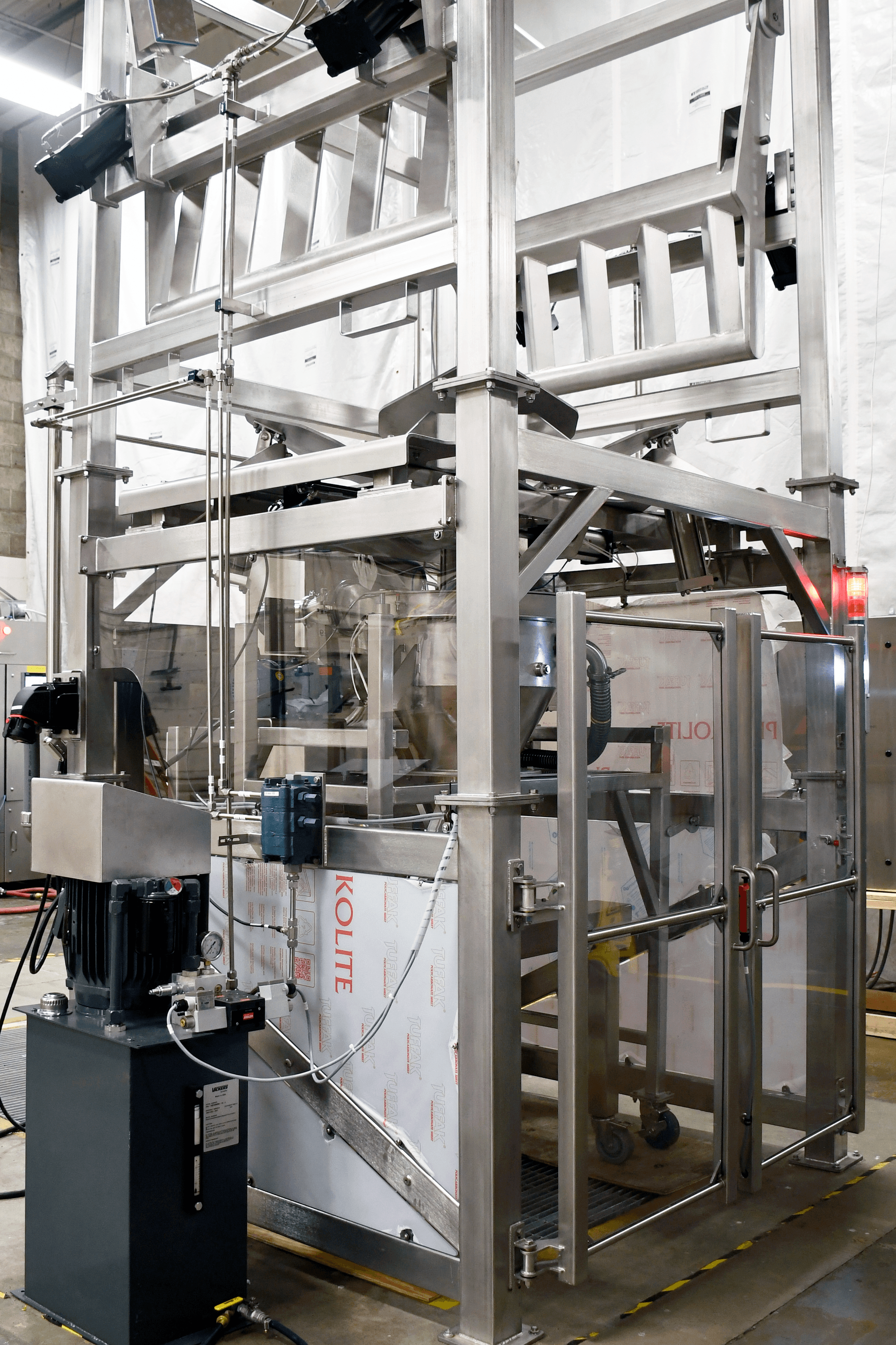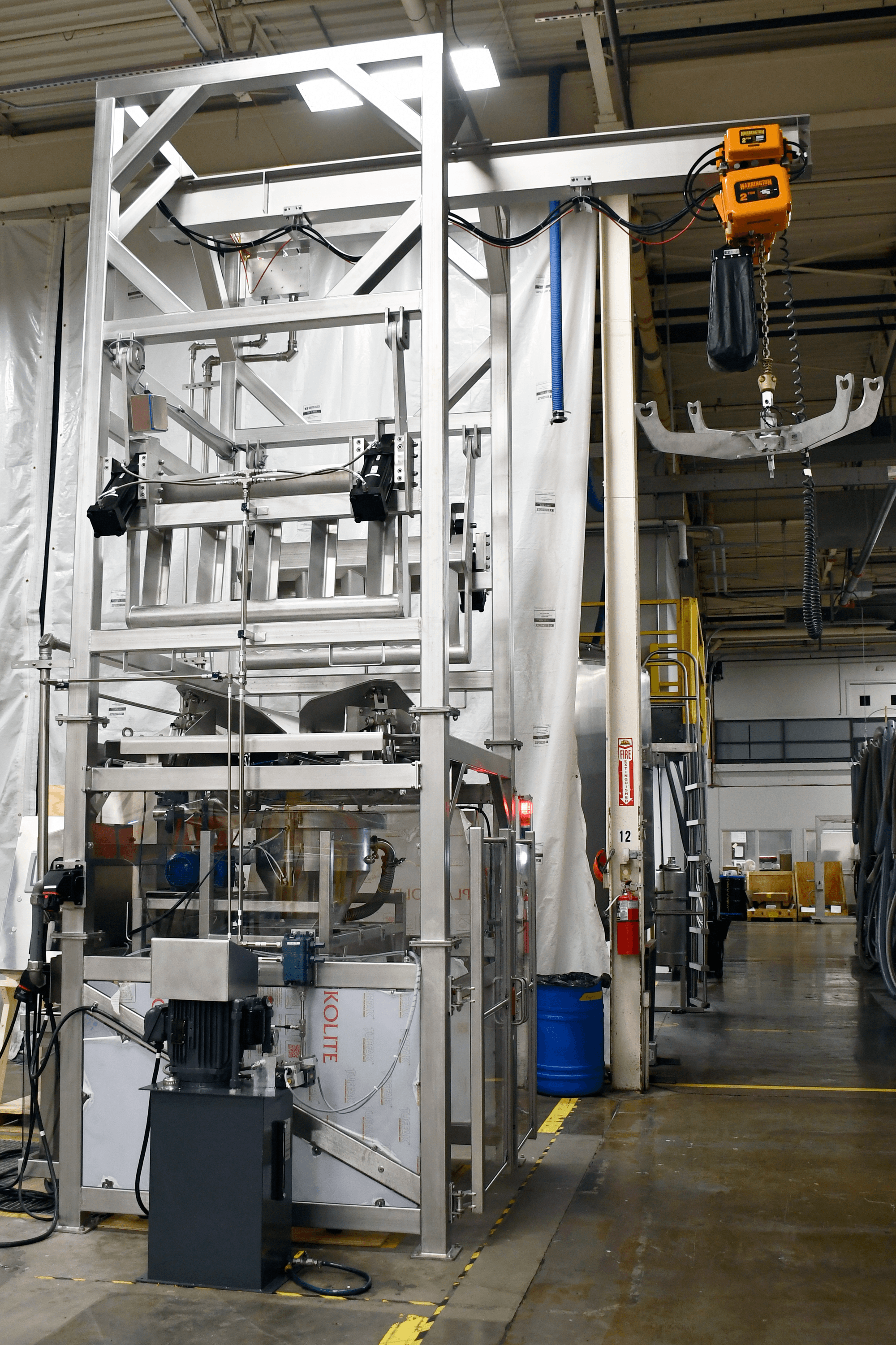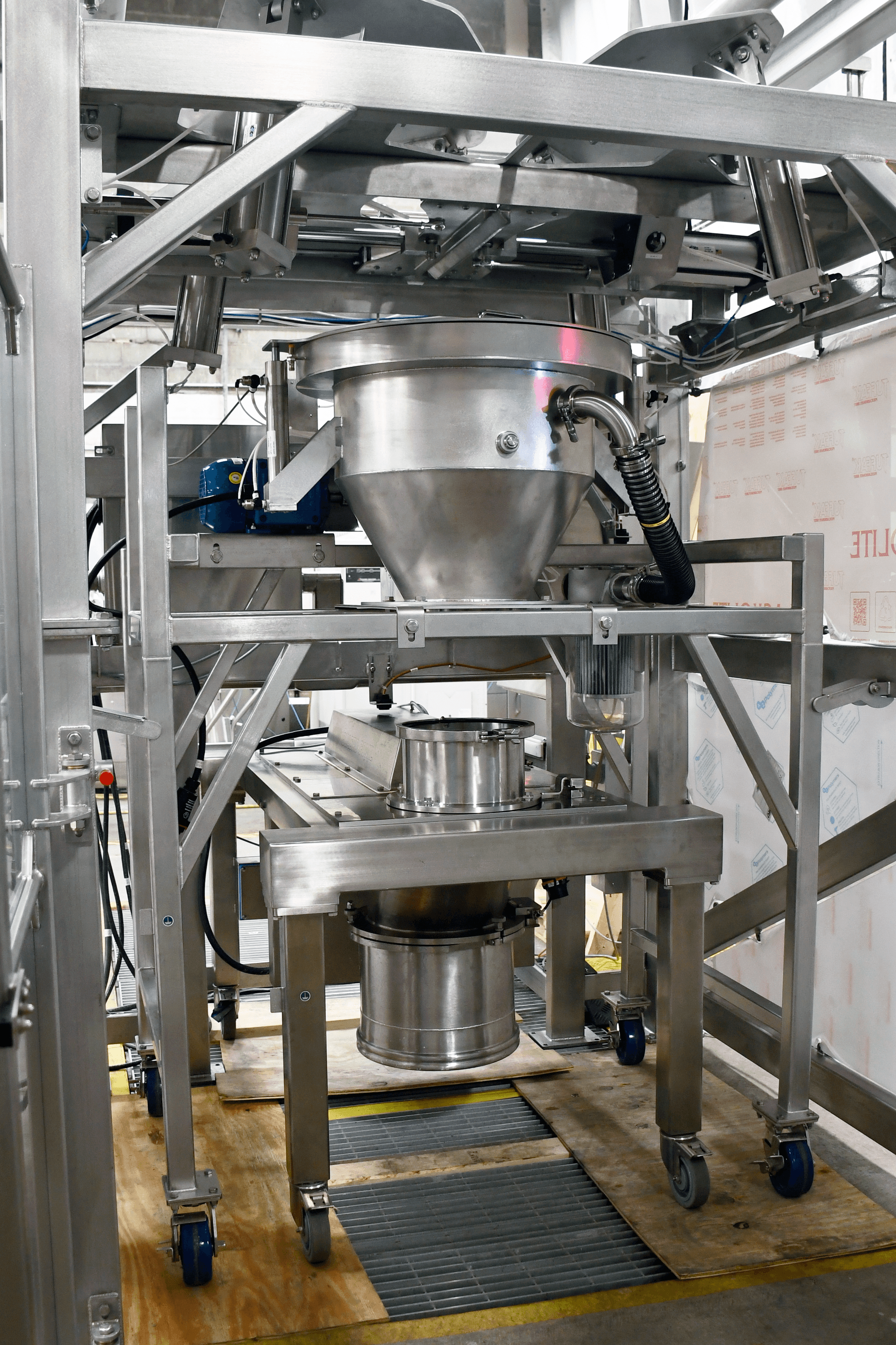 Material flows through a sanitary wye and is dispensed into receiving bins positioned on a pit scale. This scale provides real-time weight feedback to the system PLC, enabling precise control over dosing. API dosing is managed by a sanitary rotary dosing valve, which achieved an accuracy of ±1 kg. A ground monitoring system is connected to the receiving bin to control static discharge, and the system is fully compliant with Class II, Division 2 requirements for low Minimum Ignition Energy (MIE) API powders.