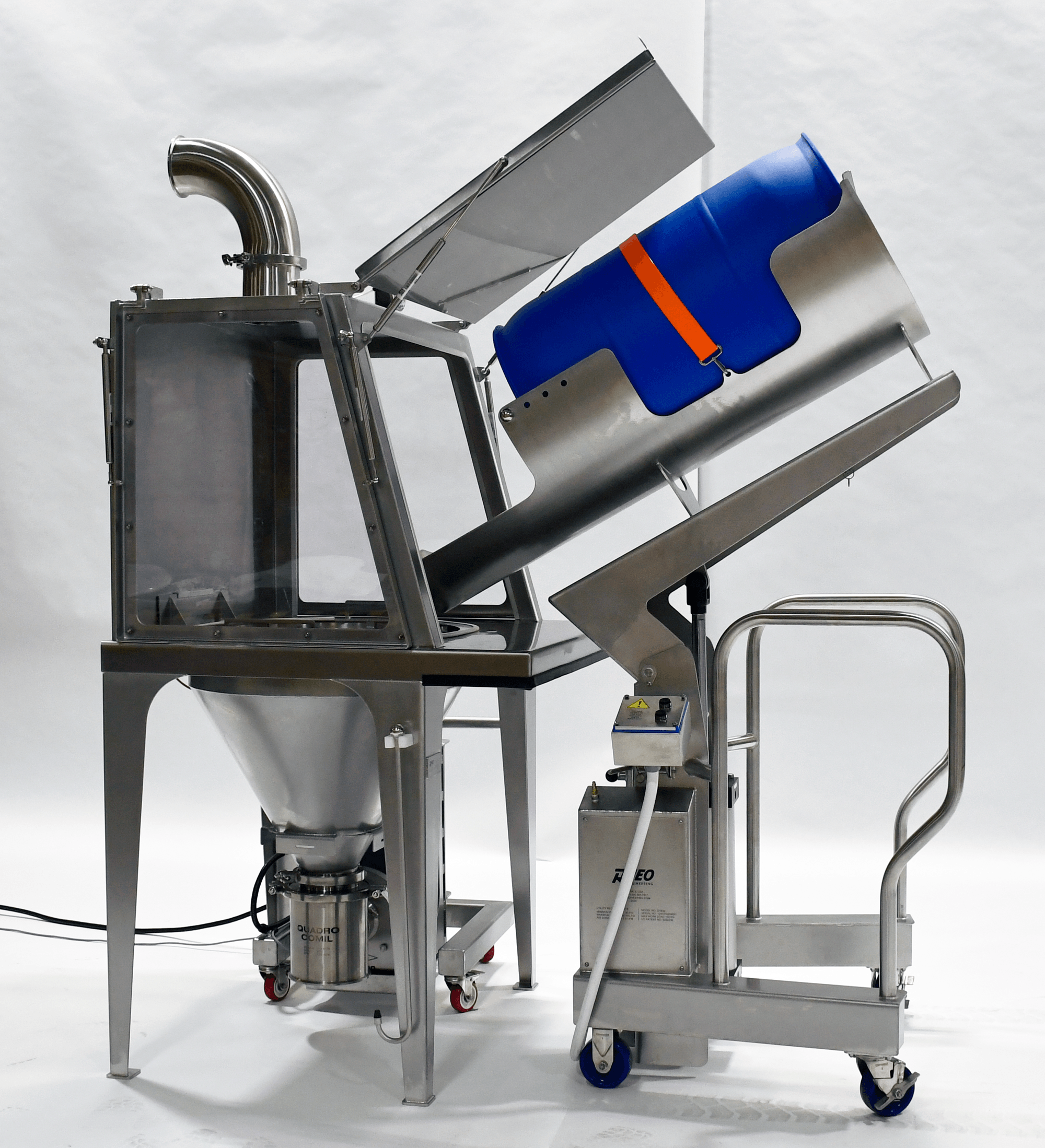 This system facilitates the weigh and dispense transfer of materials from bulk bags and drums into receiving bins through a gravity-fed process. Bulk bags containing API are unloaded using a Bulk Bag Unloading Station (BBUS), which is equipped with a hydraulic bag conditioner and pneumatic massage paddles to promote consistent material flow. Excipients are introduced separately through a drum dumping station. Both the API and excipient handling lines are equipped with Comil delumpers to break up agglomerates and ensure a uniform material size.
