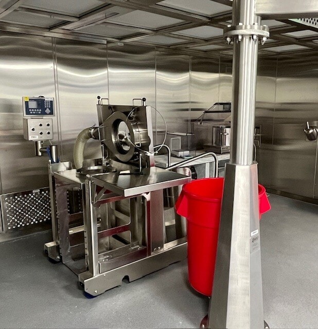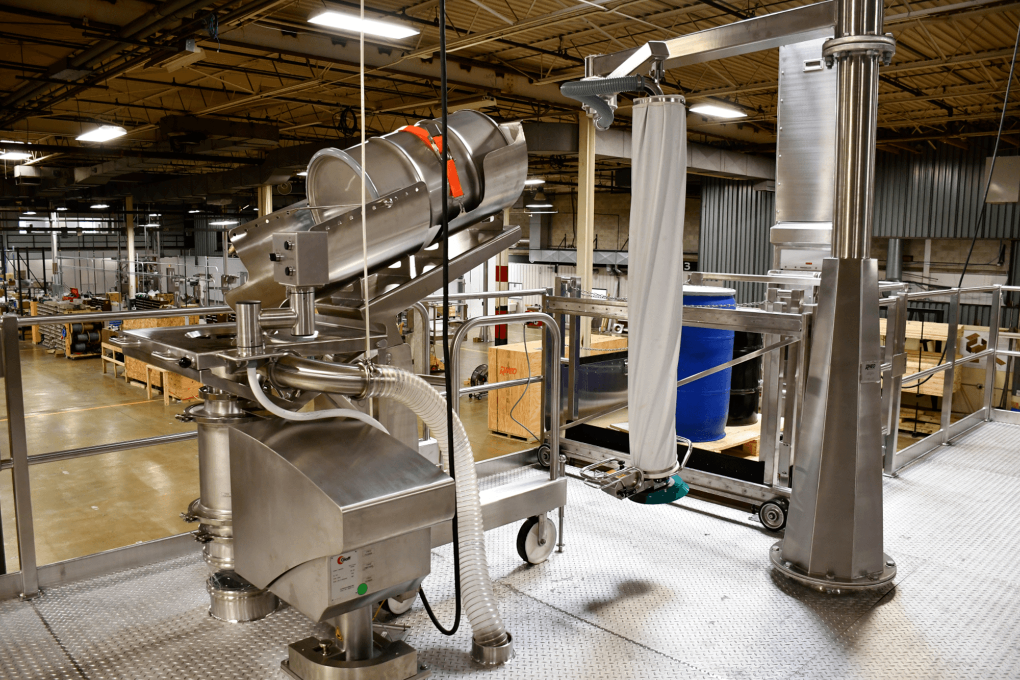 Ein Quadro Comil sorgt dafür, dass das Material beim Befüllen des Behälters auf die gewünschte Partikelgröße gemahlen wird. Der kundenspezifische Hebemechanismus ermöglicht einen einfachen Zugang zur Comil für Reinigung und Siebwechsel.