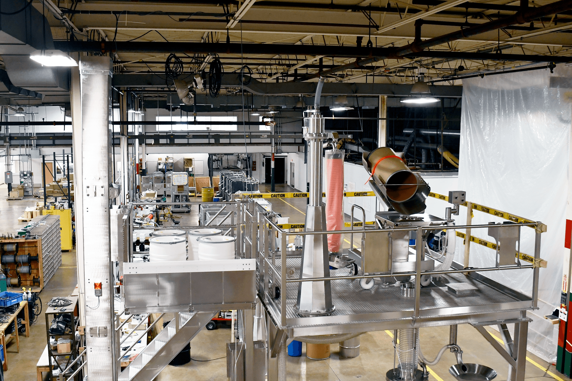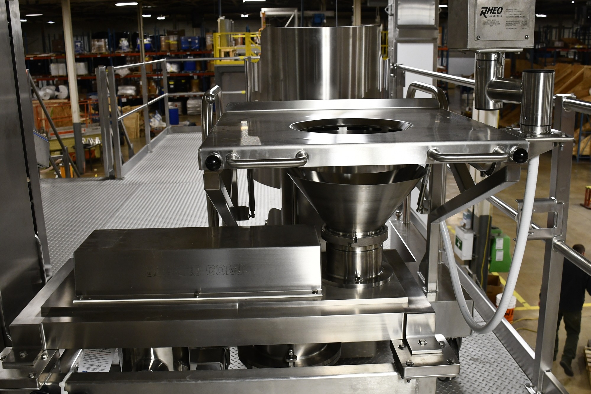 Für dieses Projekt entwarf und fertigte Rheo ein System zur Vermahlung der Zutaten (Trommel- und Sackware), wie sie in die Mischerbehälter geladen wurden. Dieses System verfügte über eine aufblasbare Dichtung, um den Transfer zwischen dem Comil und dem Behälter in einem geschlossenen System zu erleichtern, sowie über einen kundenspezifischen Hebemechanismus, um einen einfachen Zugang zum Comil für Reinigung und Siebwechsel zu ermöglichen. Das gesamte Zwischengeschoss und die Treppe wurden von Rheo entworfen und gefertigt, um dem Kunden eine schlüsselfertige Installation zu bieten.