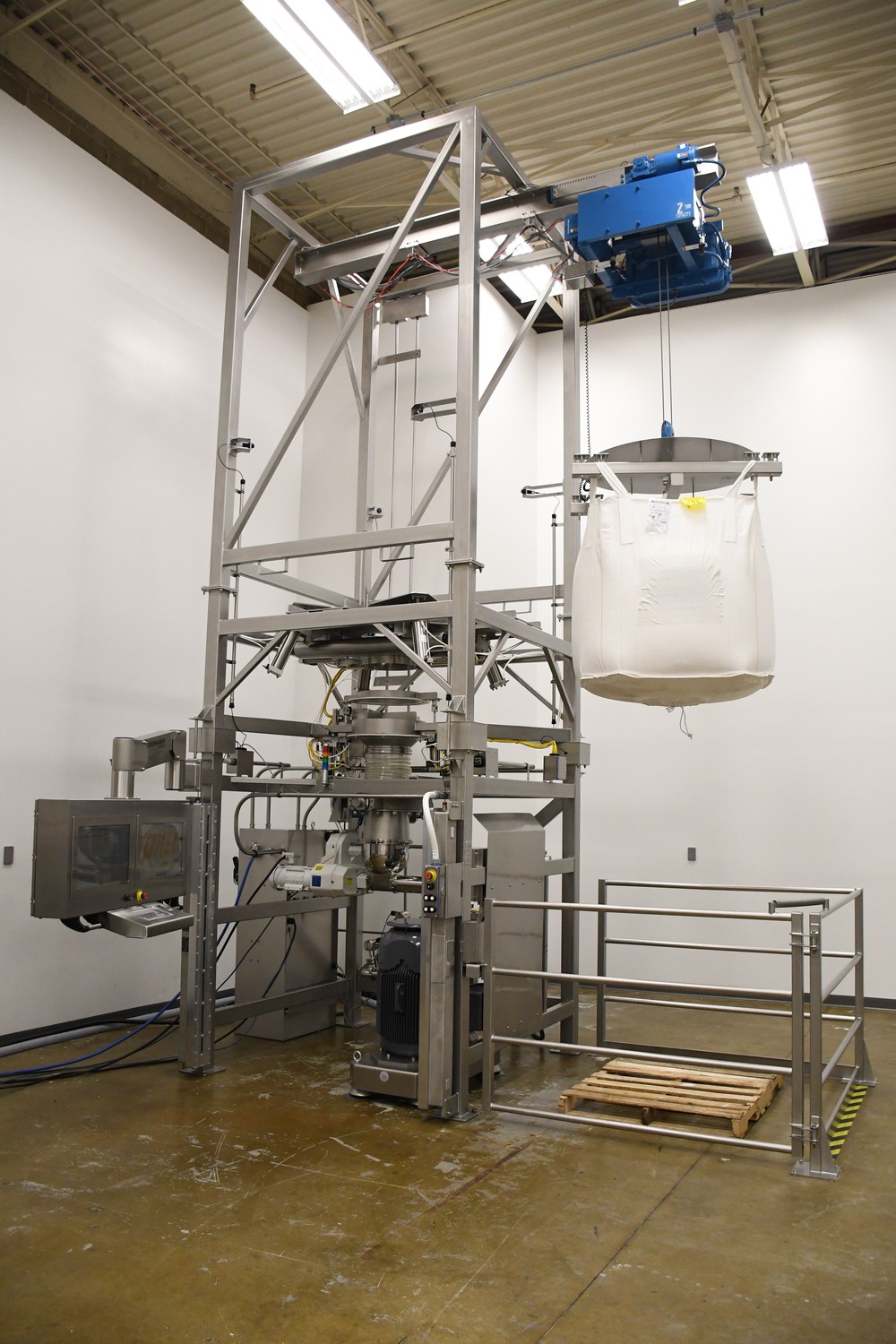 Das Hebezeug bietet einen schnellen und einfachen Andockvorgang, der über die HMI und SPS des Systems gesteuert wird. Eine integrierte Zugkraft-Wägezelle verhindert das unbeabsichtigte Anheben von übergewichtigen Säcken. Ultraschallsensoren kommunizieren mit dem Steuersystem, um die Schüttgutsäcke automatisch in die Andockstation zu heben und zu positionieren.