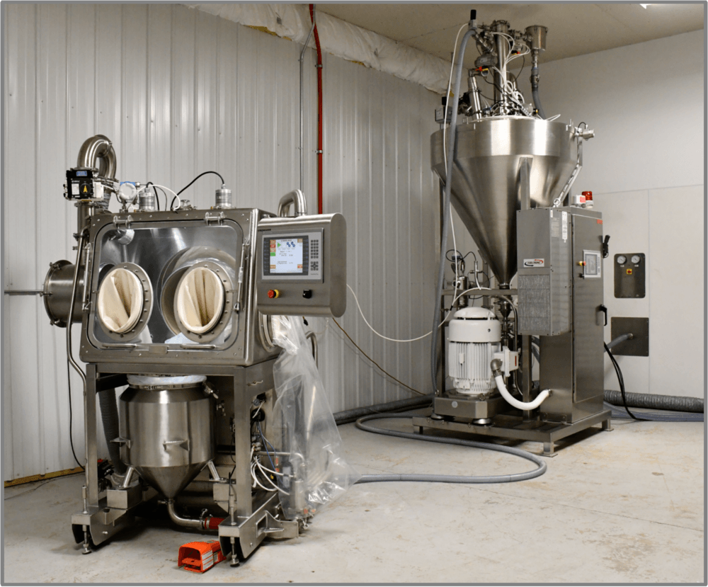 Für dieses Projekt entwarf und fertigte Rheo ein integriertes System zur Überführung einer Vielzahl hochpotenter Materialien in Prozessbehälter durch einen Mischer mit hoher Scherkraft. Dieses schlüsselfertige System bestand aus einer Materialübergabestation, einem Vakuumfördersystem, einem kundenspezifischen Trichterschlitten, einem Inline-IKA-Dispergierer und einem integrierten Steuerungssystem.