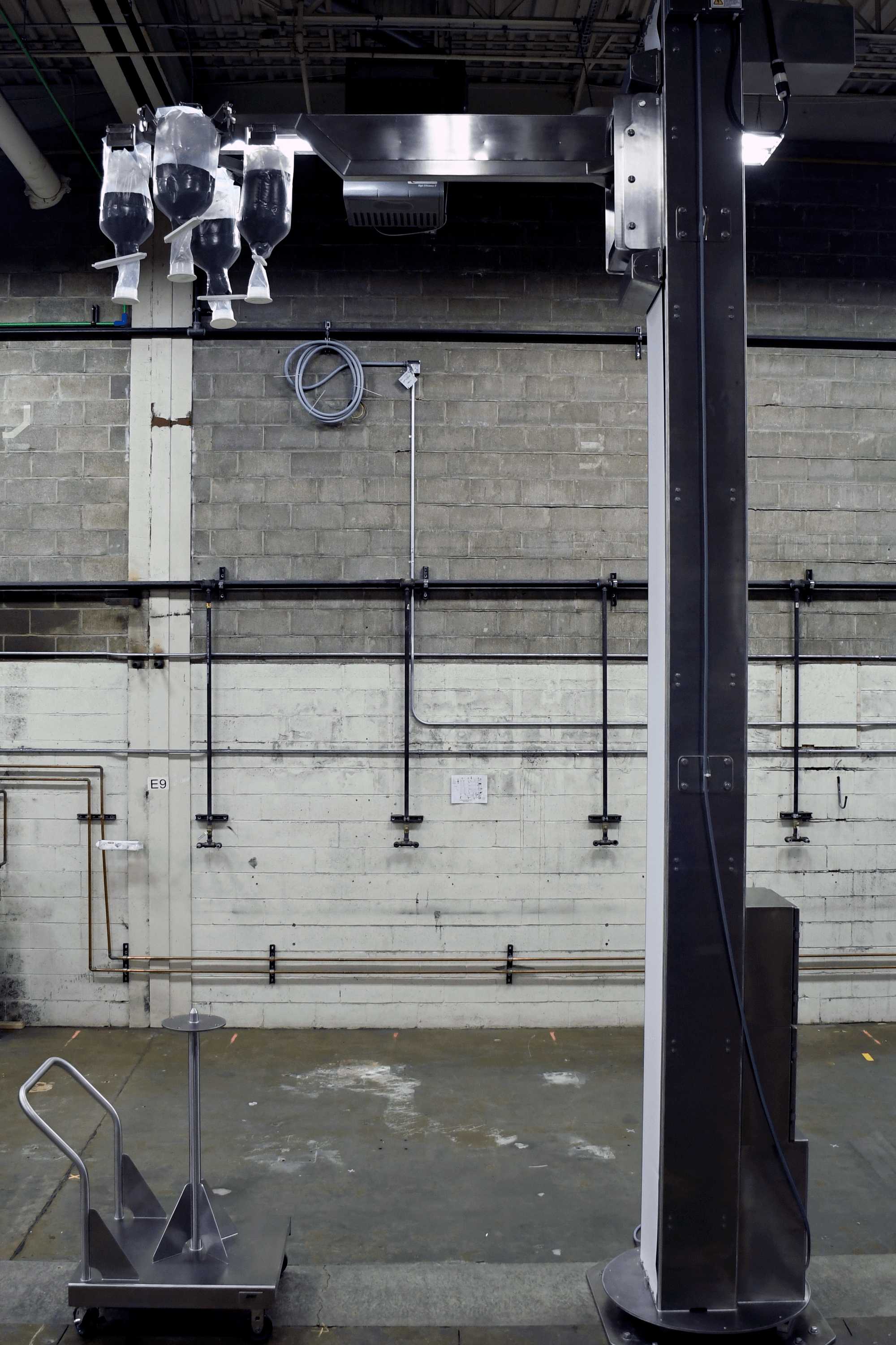 Für dieses Projekt entwarf und fertigte Rheo einen maßgeschneiderten Beutelheber, der das Anheben und Positionieren mehrerer Einwegbeutel über einem Mischer im zweiten Stockwerk unterstützt. Das System war mit einem schwenkbaren Beutelkarussell ausgestattet, das den Austausch von vier Beuteln am Mischereinlass ermöglichte. Das Karussell wurde so konstruiert, dass es leicht auf einem Transportwagen platziert und aufgenommen werden kann, damit die Einwegbeutel auf dem Wagen befüllt und dann zum Entladen am Heber befestigt werden können.
