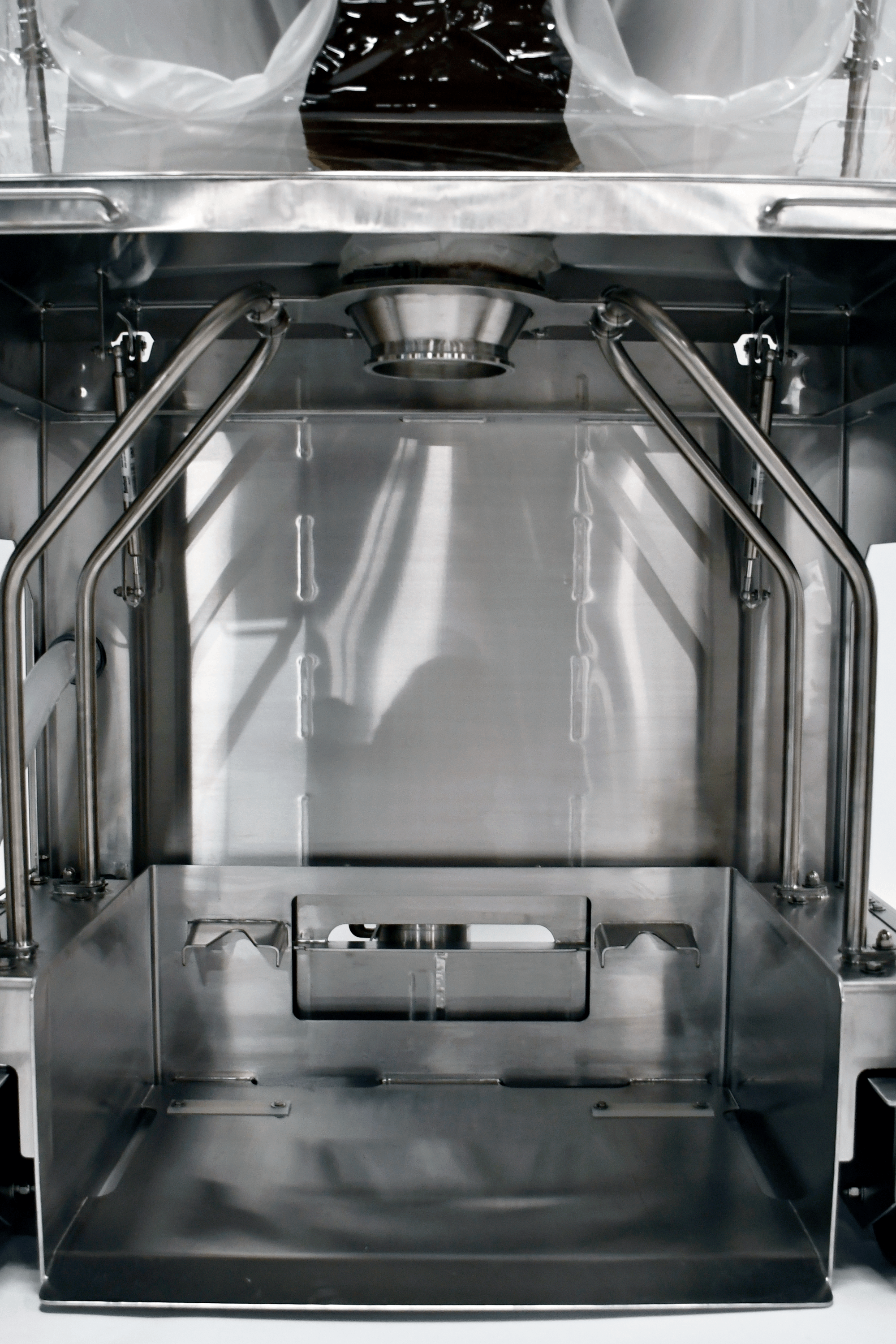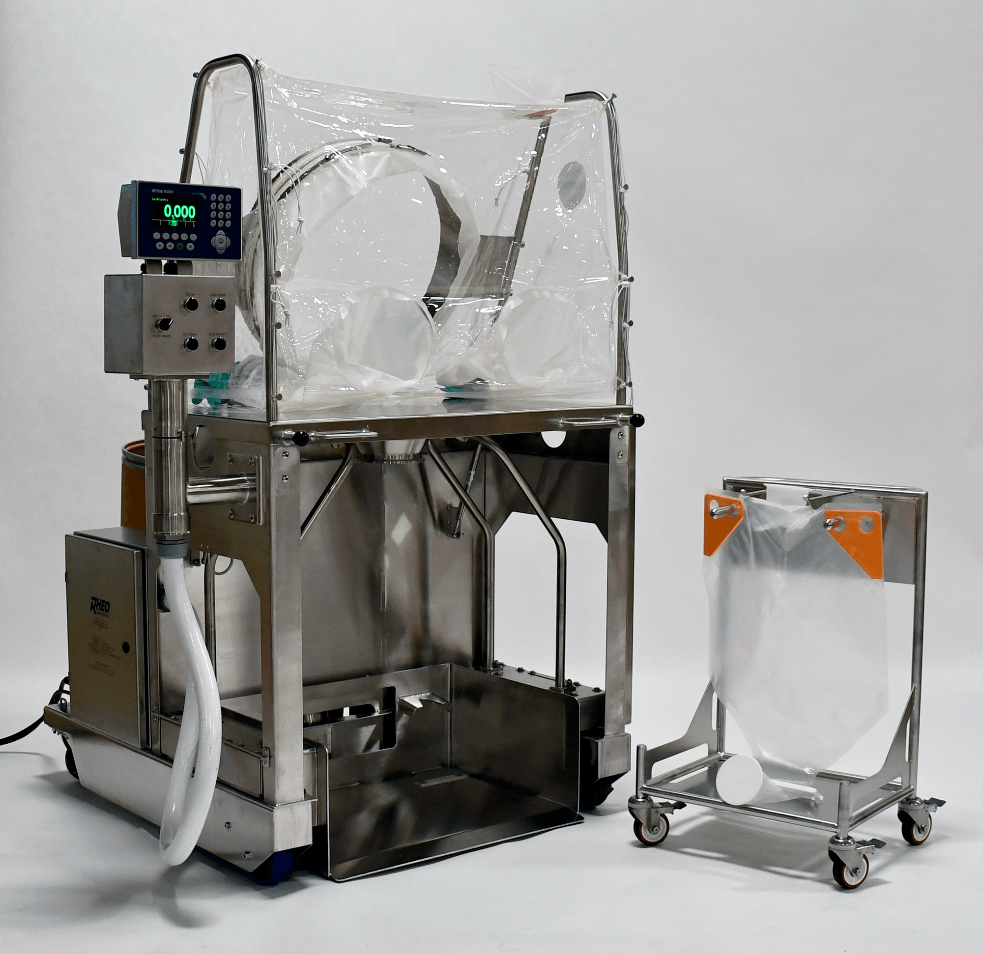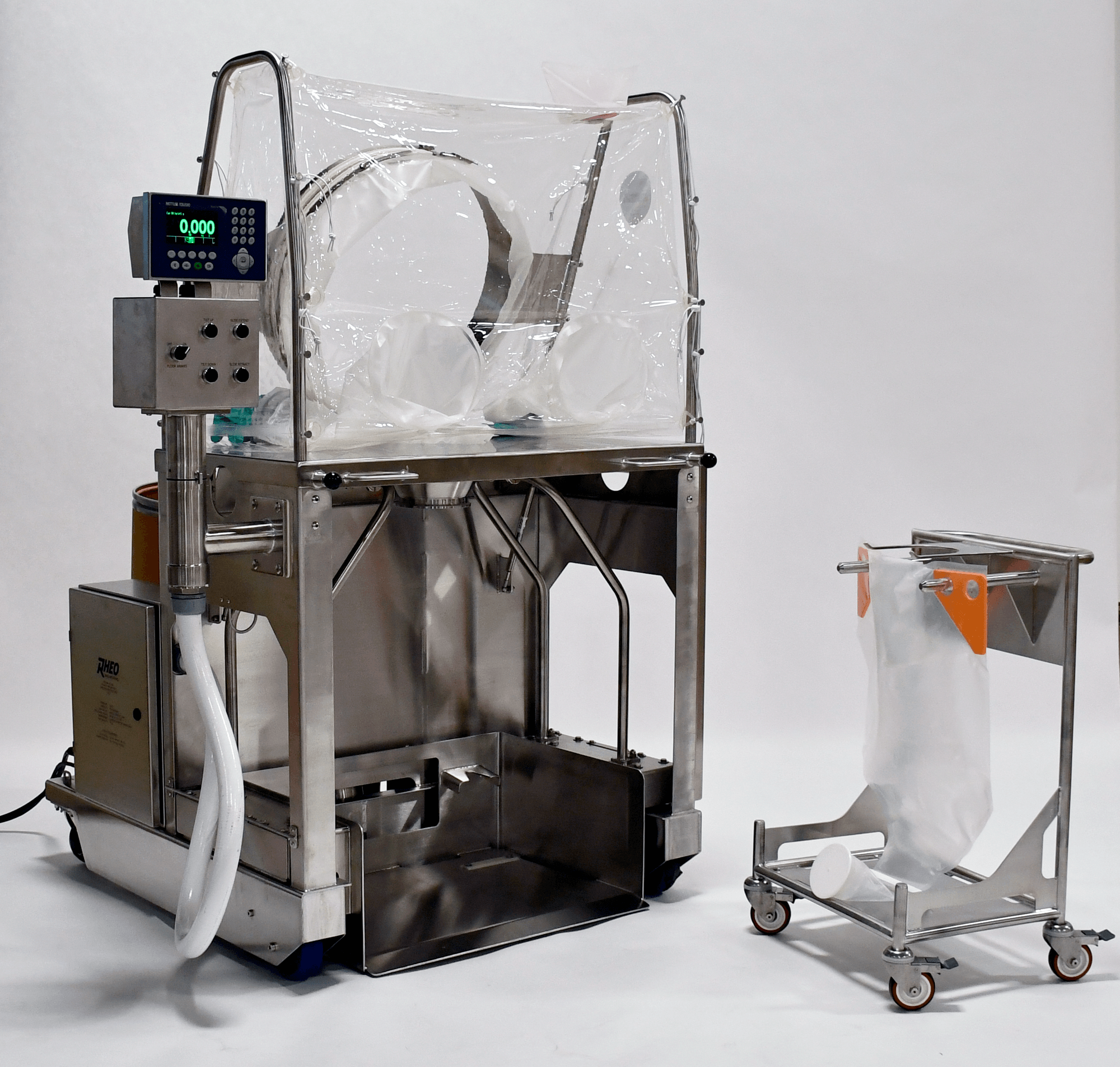 Die Materialtransferstation (MTS) ist eine kompakte Arbeitsstation, die die Dosiereffizienz und die Ergonomie des Bedieners verbessert. Ein Fasskipper hebt und schiebt den Rohmaterialbehälter in eine Position direkt über dem Einwegbeutel-Einlass, so dass der Bediener für eine präzise Dosierung leichten Zugang zum Produkt hat. Eine verstellbare Fasswiege kann durch ein kundenspezifisches Wiegeprofil und mehrere Fassanschlagspunkte ein 100-kg-Polyfass oder einen 5-kg-Poly-Eimer aufnehmen. Diese MTS-Einheit konnte das Produkt aus über sechs (6) verschiedenen Rohstoffbehältern umfüllen und gleichzeitig über einen flexiblen Isolator eindämmen.