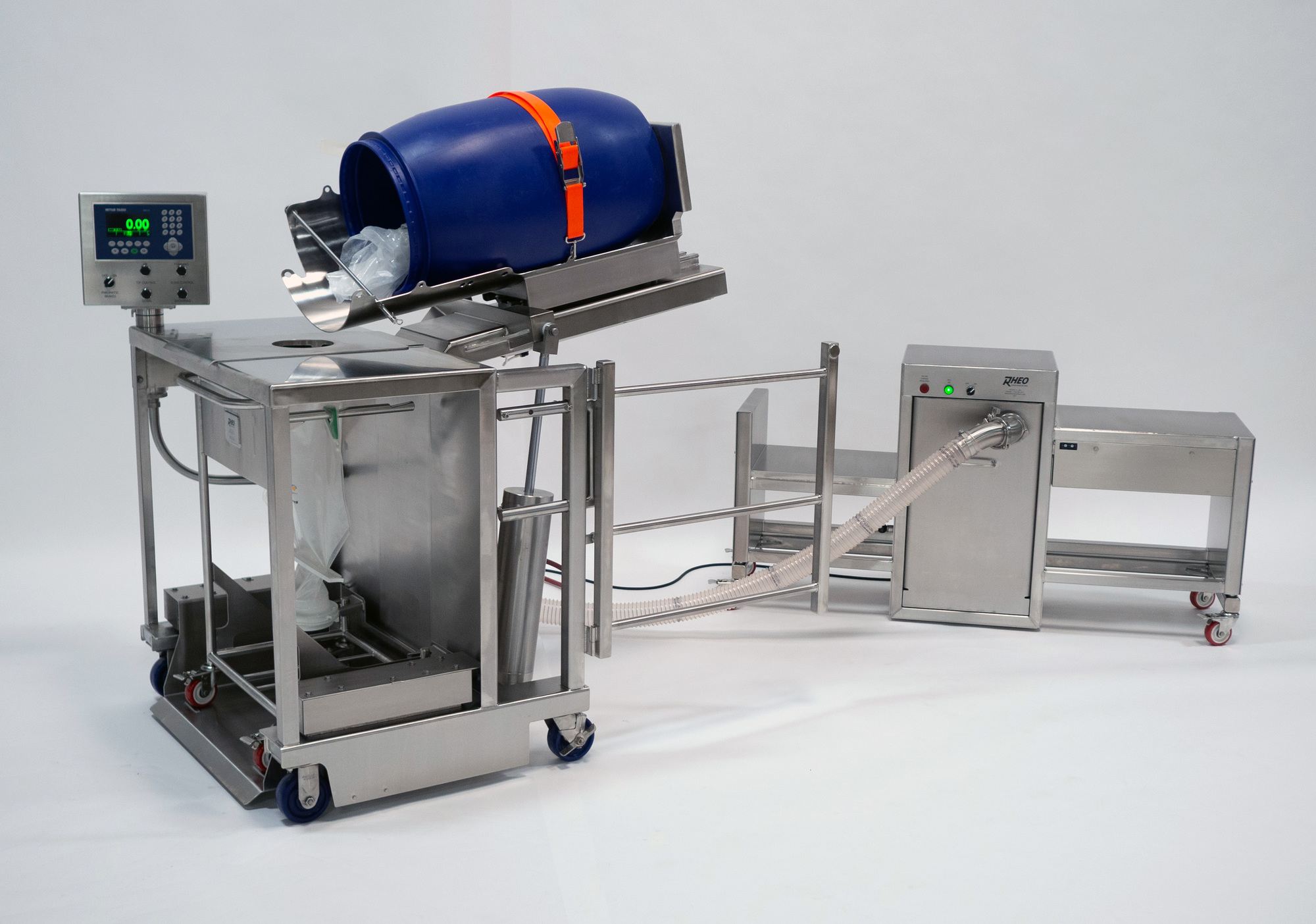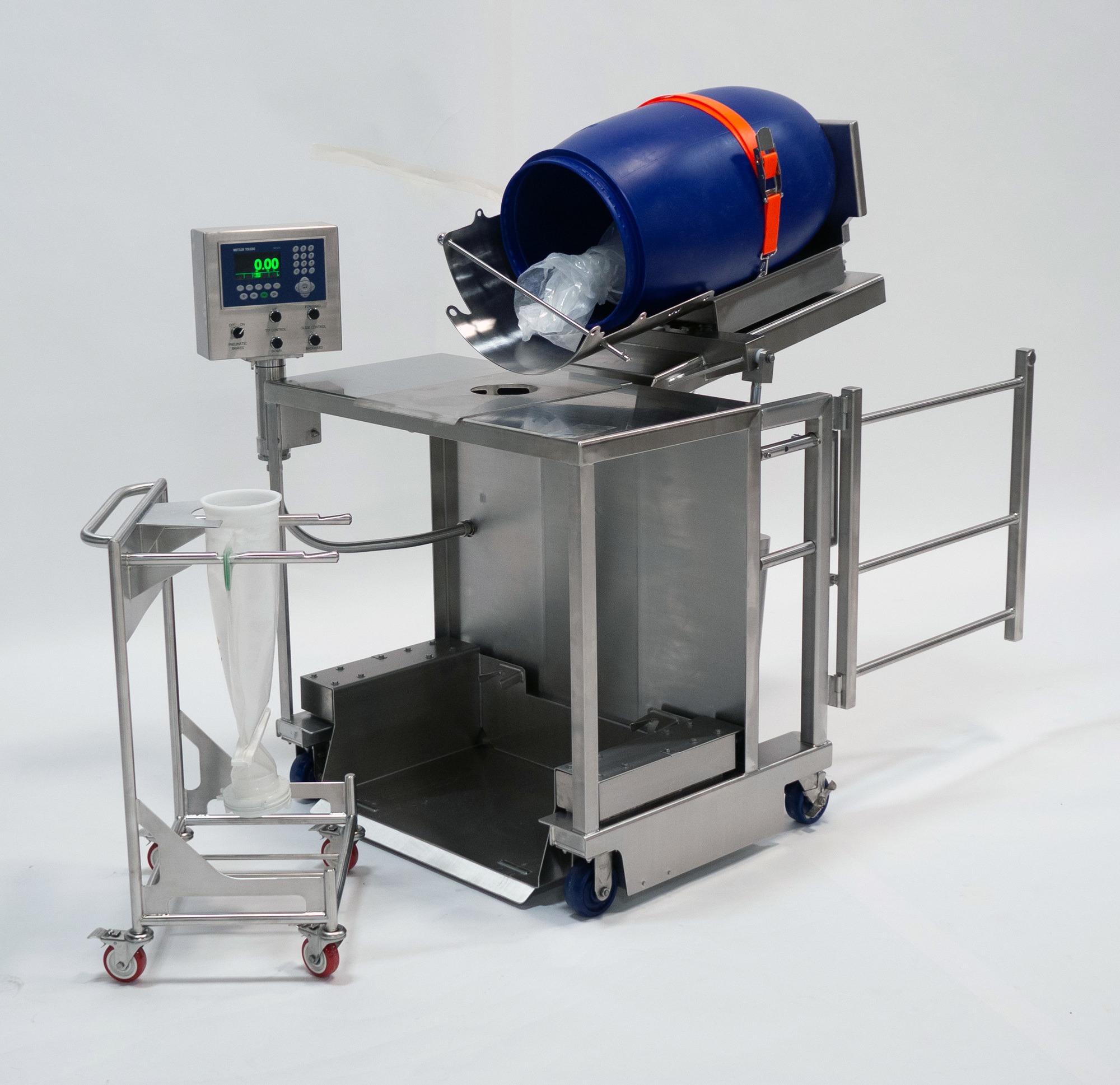Die Materialtransferstation (MTS) ist eine kompakte Arbeitsstation, die die Dosiereffizienz und die Ergonomie des Bedieners verbessert. Ein Fasskipper hebt und schiebt den Rohmaterialbehälter in eine Position direkt über dem Einwegbeutel-Einlass, so dass der Bediener für eine präzise Dosierung leichten Zugang zum Produkt hat. Eine verstellbare Fasswiege kann durch ein kundenspezifisches Wiegeprofil und mehrere Fassanschlagspunkte ein 100-kg-Polyfass oder einen 5-kg-Poly-Eimer aufnehmen. Dieses MTS-Gerät konnte das Produkt aus über sechs (6) verschiedenen Rohstoffbehältern umfüllen und gleichzeitig durch eine strategisch platzierte Rheo-Belüftungshülse für einen sicheren Schutz sorgen.