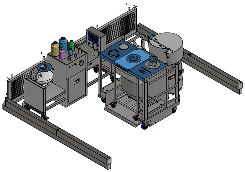 Für dieses Projekt entwarf und fertigte Rheo ein kompaktes Materialtransfersystem zum genauen Wiegen und Abfüllen verschiedener Inhaltsstoffe in Einwegbeutel und Edelstahlkanister. Das System umfasste kundenspezifische Transportwagen für die Einwegbeutel, die eine Andockschnittstelle mit dem Wiegemodul der Material Transfer Station (MTS) ermöglichten. Diese Kombination ermöglichte einen effizienten Prozessablauf und ein ergonomisches Mittel für hochgenaues Wiegen und Dosieren. Der Grundriss der Suite machte es außerdem erforderlich, dass die Geräte so konzipiert wurden, dass sie wenig Platz beanspruchen und leicht zu manövrieren sind.